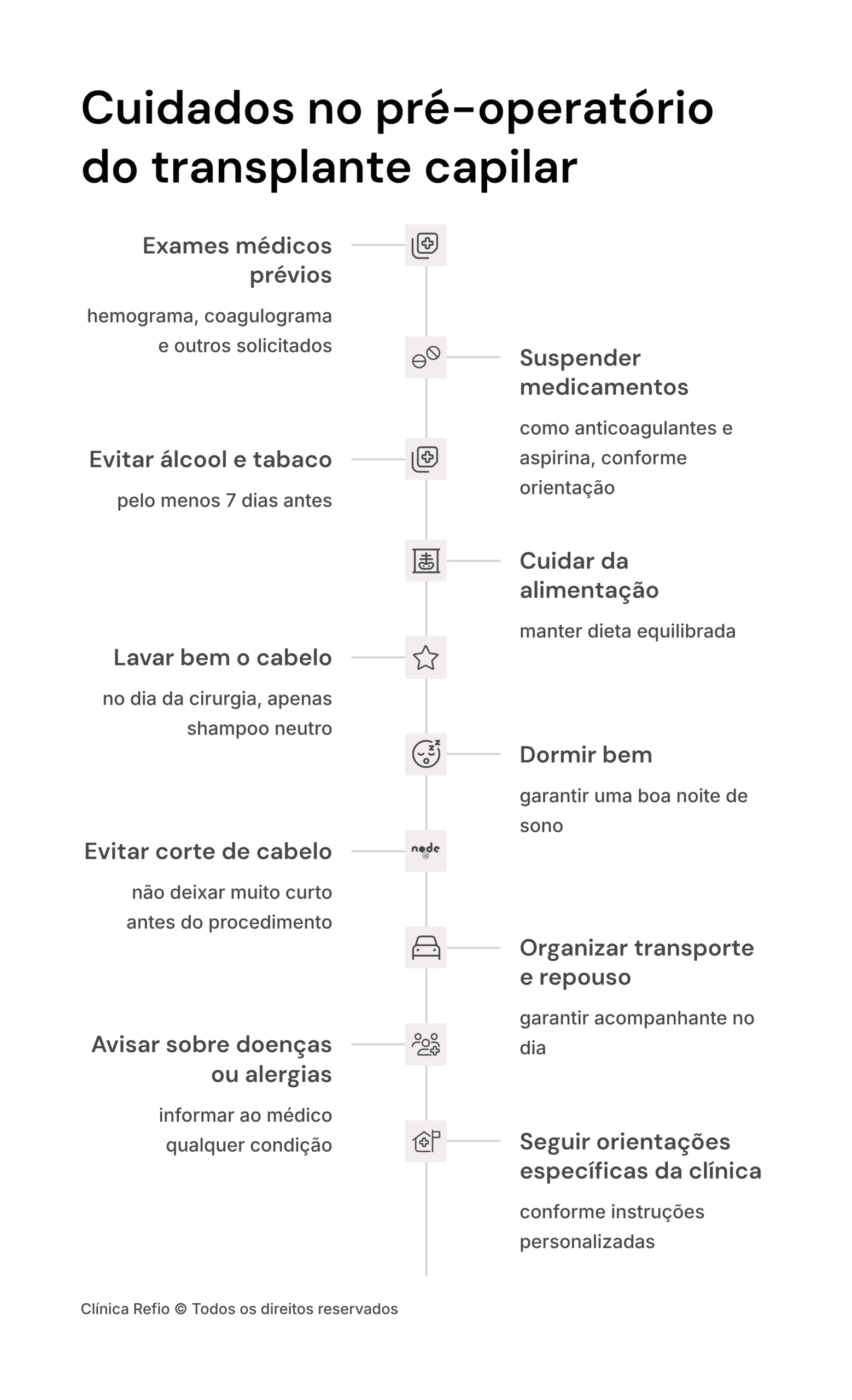 Orientamos sobre a suspensão de certos medicamentos e restrições alimentares. A higiene do couro cabeludo nos dias anteriores também é um cuidado essencial.