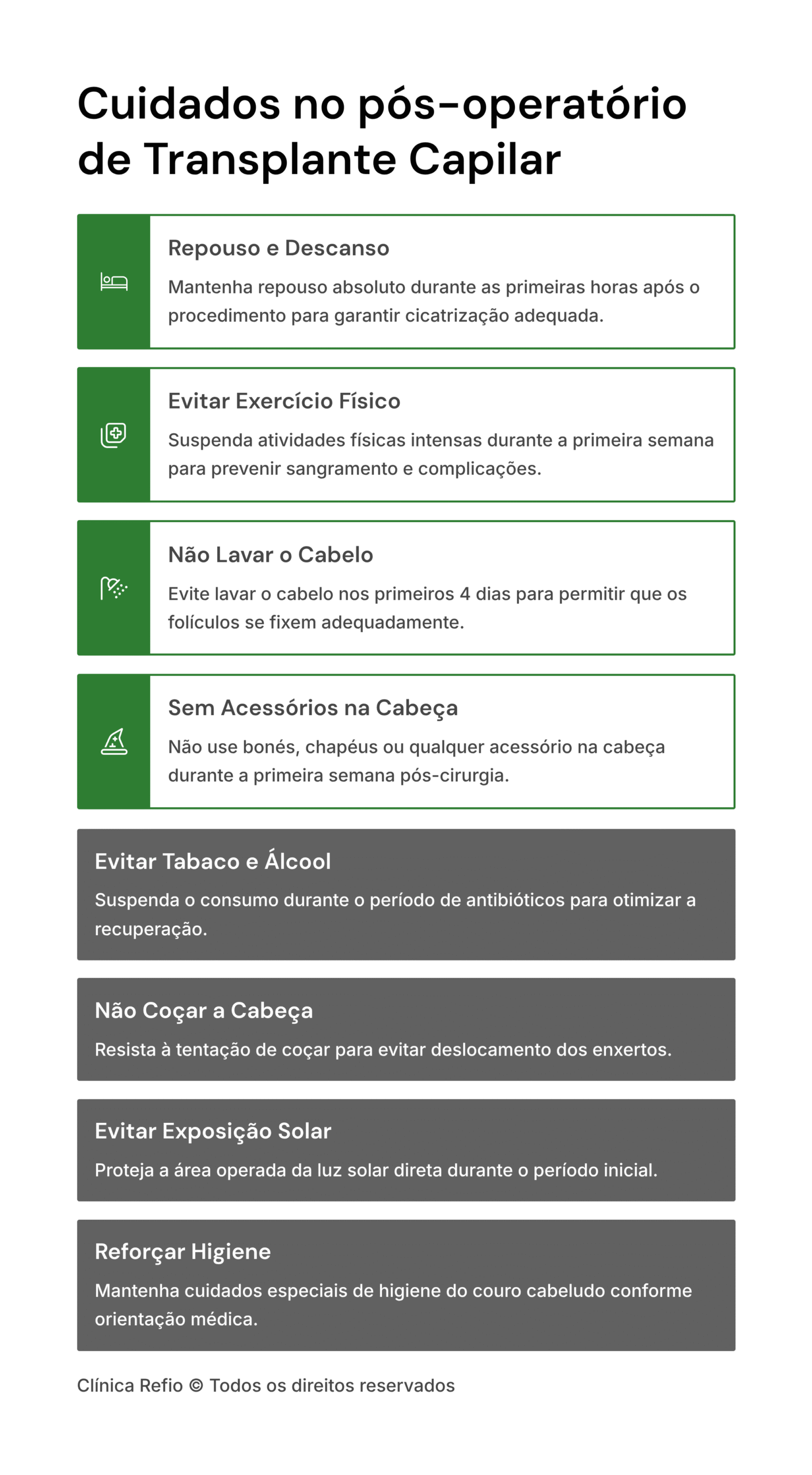 Medicamentos prescritos e restrições temporárias de atividades garantem a cicatrização ideal. O acompanhamento médico regular monitora o crescimento dos novos fios.